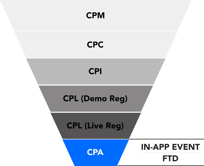 このプログラムは、コストパーアクション(CPA)の基準で報酬を得るための優れたデジタルマーケティング技術を持つ広告代理店向けに設計されています。有効なAppsFlyer Agencyアカウントを持つ広告代理店は、特定のアクション(アプリ内デポジット)を達成するためのデジタルマーケティング戦略を実装し、取得したアクションごとに報酬を得ることができます。